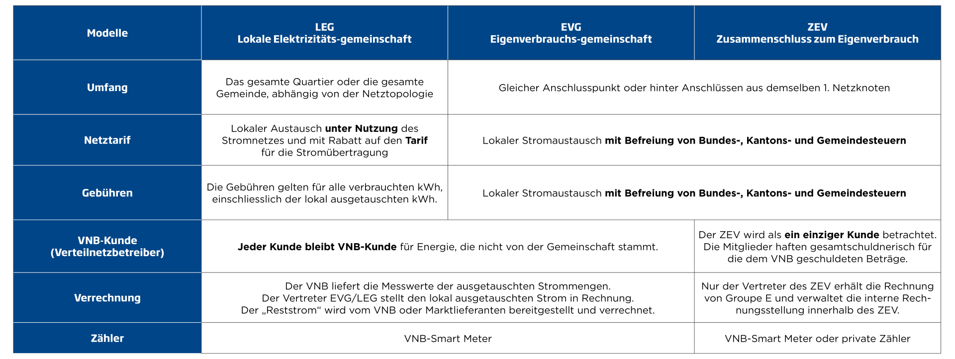 LEG: LEG-Verbrauchsorte müssen sich im Versorgungsgebiet von Groupe E befinden. Alle Teilnehmer der LEG müssen innerhalb derselben Gemeinde an dasselbe Netz angeschlossen sein, und der Stromaustausch muss ohne Hochspannung erfolgen. Die Gesamtleistung der an der LEG beteiligten Produktionsanlagen muss mindestens 5% der Anschlussleistung der angeschlossenen Verbraucher betragen.