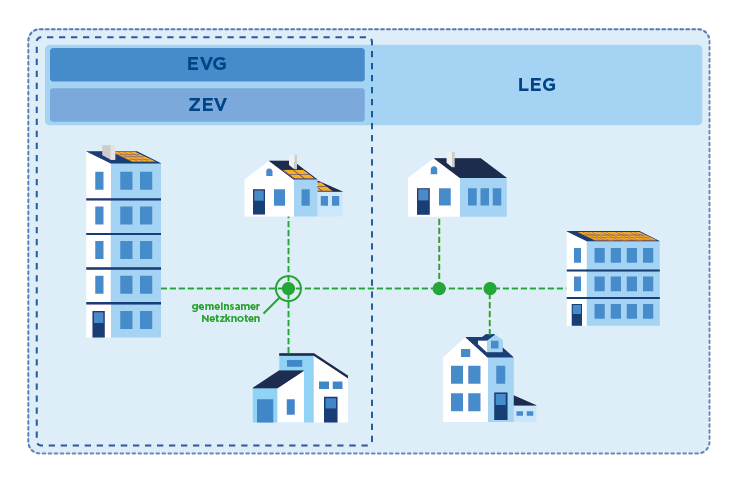 EVG: Das Modell der Eigenverbrauchsgemeinschaft ermöglicht den Austausch zwischen Stromerzeugern und Verbrauchern am selben Produktionsort (identischer Umfang wie der ZEV). Im Gegensatz zum ZEV erfordert dieses Modell jedoch keine formelle Gründung einer Gemeinschaft. Die Produzenten in einer EVG verkaufen den lokal erzeugten Strom an die Enderbraucher vor Ort. Der zur Deckung des Verbrauchsbedarfs erforderliche Reststrom wird jedem Endverbraucher vom VNB oder einem Drittanbieter bereitgestellt. Die einzelnen Teilnehmer der EVG müssen die Bedingungen für den lokalen Stromaustausch vertraglich regeln.