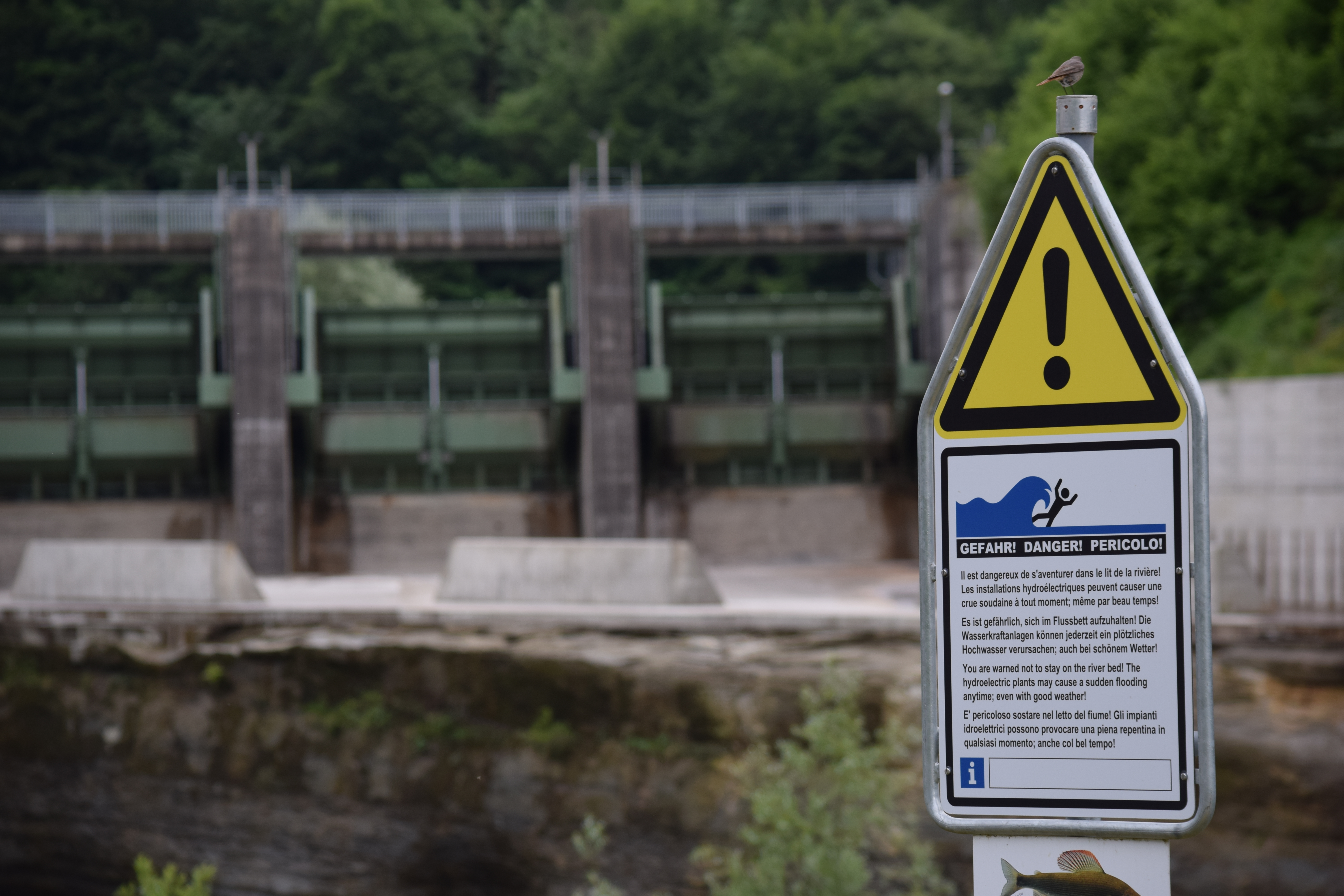Wenn wir den Fluss nutzen wollen, müssen wir äusserst wachsam bleiben. Die Schilder am Ufer weisen darauf hin, dass der Wasserstand jederzeit, unabhängig vom Wetter, ansteigen kann. Ebenso wie andere Stromerzeuger nutzt auch Groupe E ihre Wasserkraftwerke, um die Produktion permanent an den Verbrauch anzupassen und eine plötzlich fehlende Produktion von Solarenergie zu kompensieren. So kann Groupe E selbst bei schönem Wetter ihre Produktion rasch steigern und einen hohen Durchfluss im Fluss erzeugen.