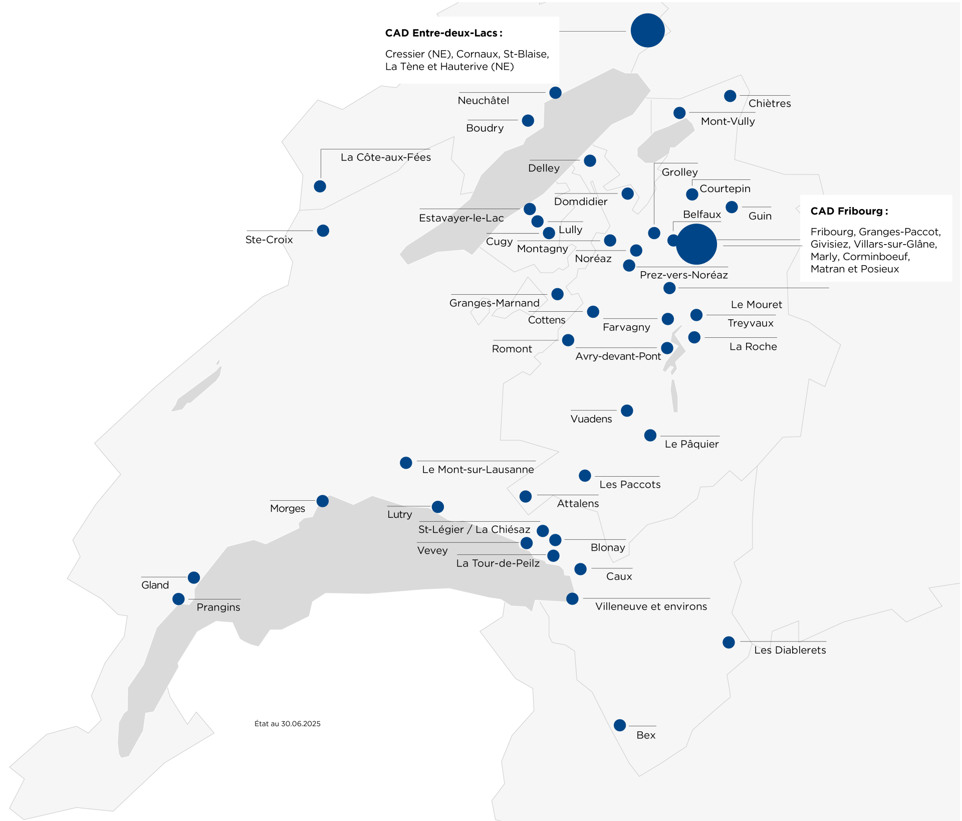 Avec plus de cinquante réseaux répartis en Suisse romande, notamment dans le Grand Fribourg, Romont, Villeneuve, Vevey, ou encore la région d’Entre-deux-lacs (Cornaux, Cressier et La Tène), nous fournissons de la chaleur à plus de deux mille clients.