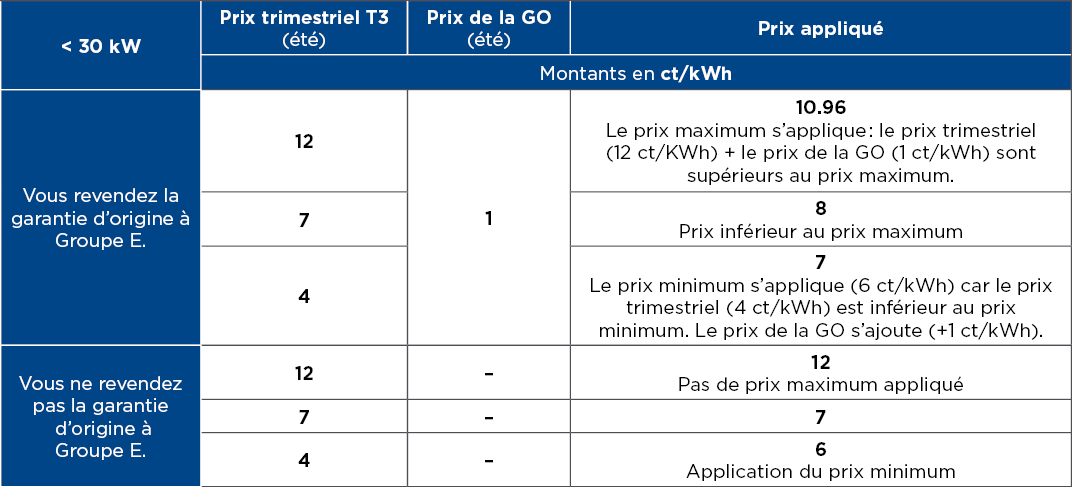 Si vous choisissez de ne pas céder votre GO à Groupe E (décision valable pour l’année entière), aucun prix maximal ne s’applique ; seul le prix trimestriel de l’OFEN (ou le tarif minimum) est appliqué.