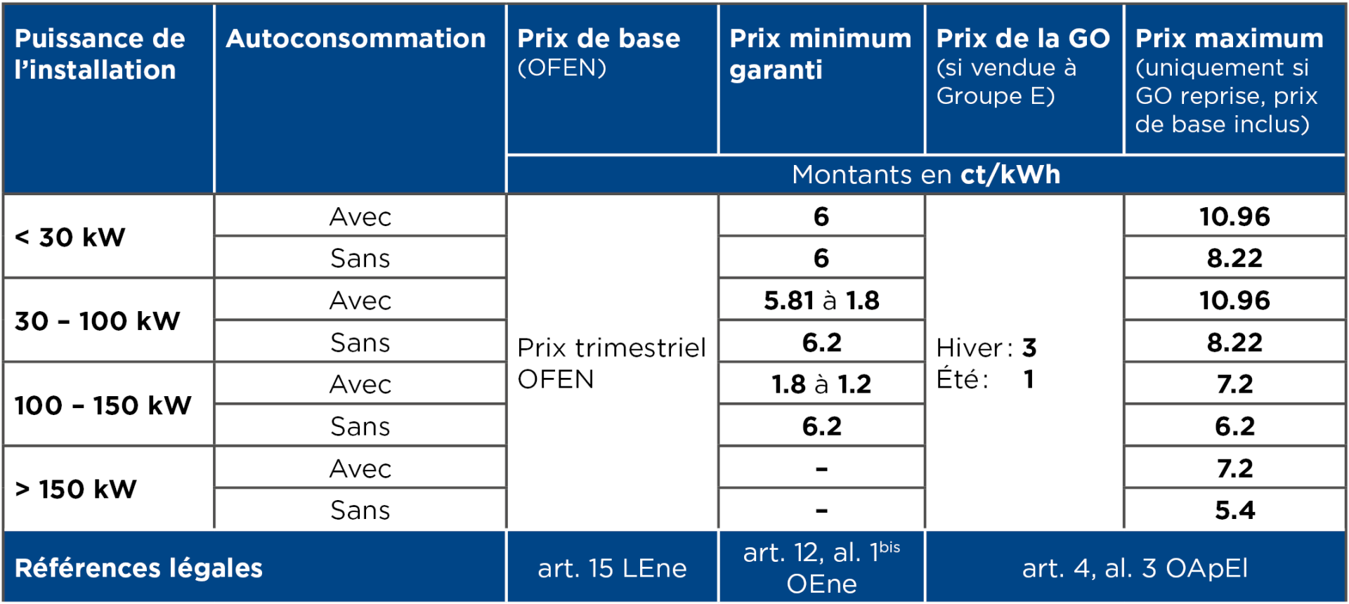 La rémunération du producteur s’applique à toute l’énergie produite et injectée sur le réseau de Groupe E. Les prix se basent sur la législation fédérale en vigueur et sur les recommandations de la branche, notamment l’art. 15 LEne, l’art. 12 OEne, l’art. 4a OApEl ainsi que sur l’annexe 1.2 de l’OEneR.