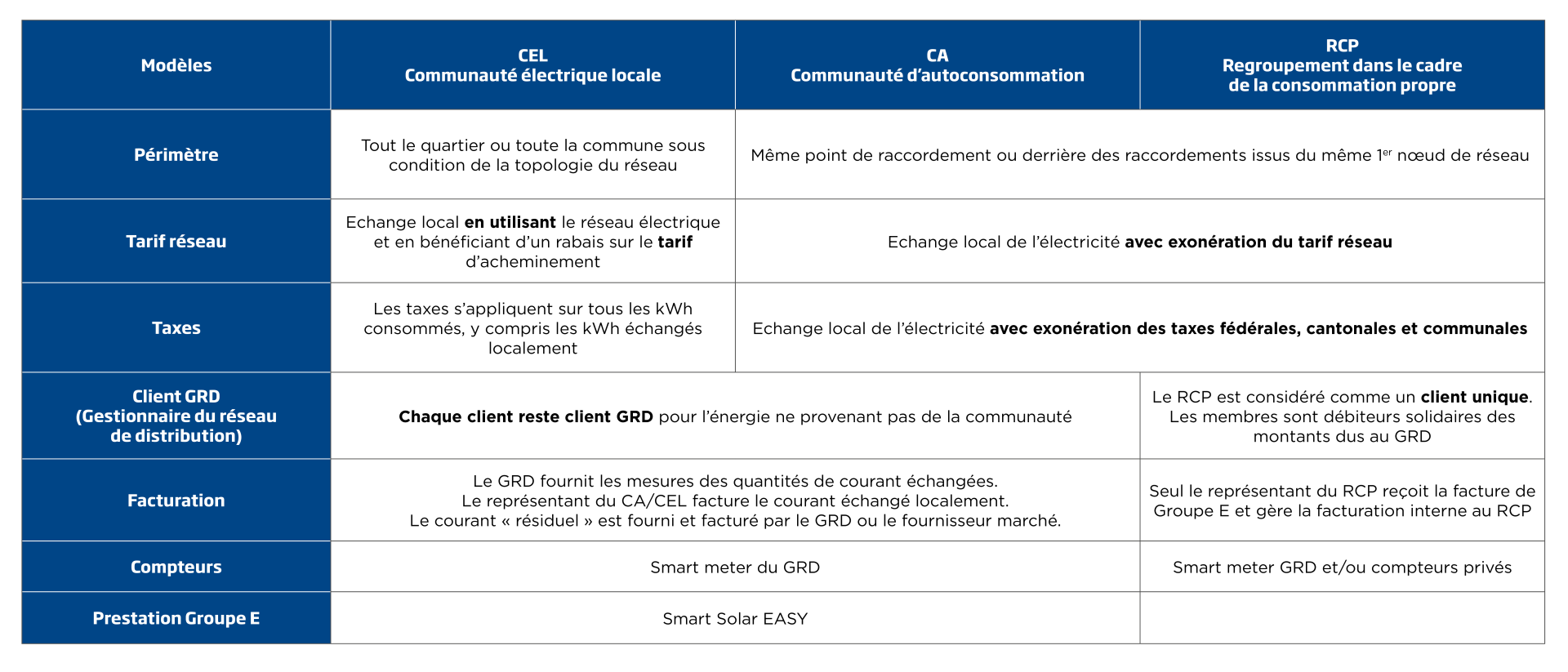 - CA : le modèle de communauté d’autoconsommation permet l’échange entre producteurs d’électricité et consommateurs situés sur un même lieu de production (périmètre identique au RCP). Contrairement au RCP, ce modèle ne nécessite pas la formation formelle d’un regroupement. Le ou les producteur(s) intégrant la CA vend(ent) l’électricité produite localement aux consommateurs du site. Le solde nécessaire à couvrir les besoins de consommation est fourni par le GRD ou un fournisseur tiers à chaque consommateur final. Les différents participants de la CA doivent régler contractuellement les conditions d’échange local d’électricité.